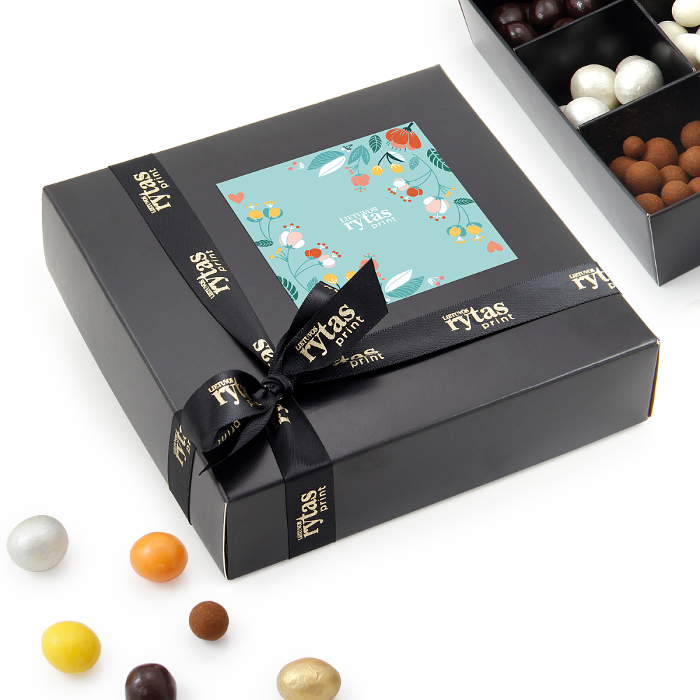 Chocolate dragee sweets set in a black box with colorful advertising sticker. Selected nuts, northern berries, fruit sweetness and sourness immersed in extremely fragrant high quality Belgian chocolate. Sounds like a perfect Christmas business gift for employees or clients? Selection of different colors and flavors.