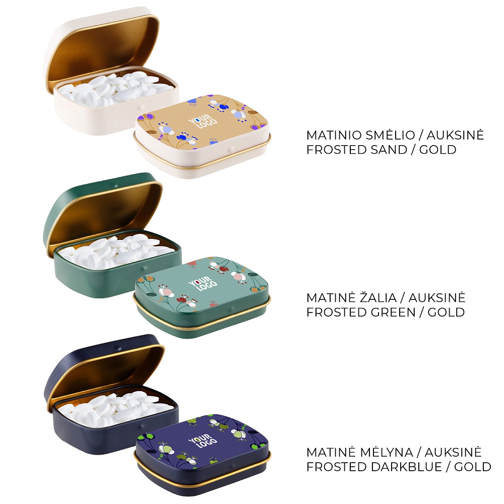 Refreshing mint pastilles in a colorful metal tin with your logo.