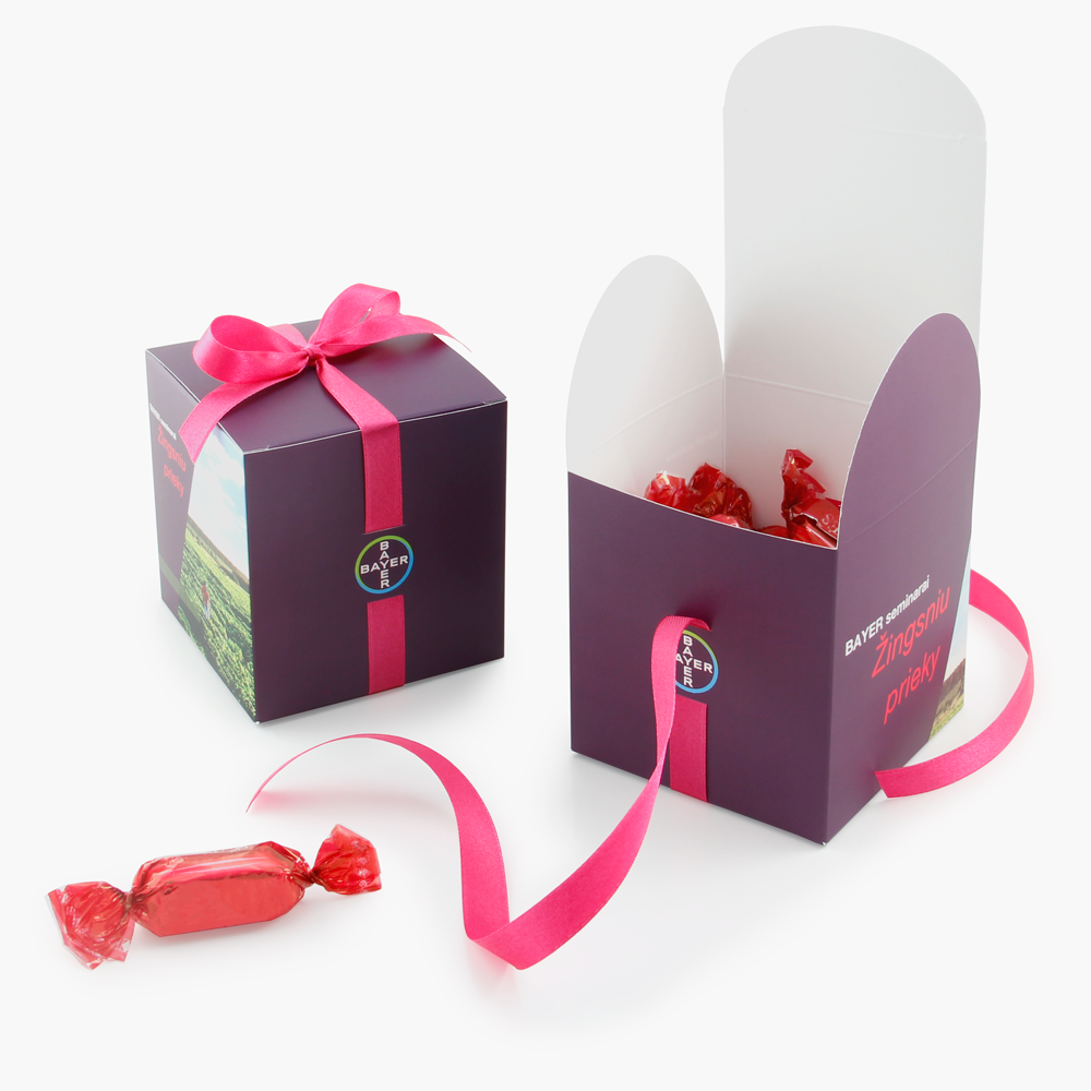Papildomai pagaminsime juostelę su Jūsų logotipu ar užrašu dėžutės papuošimui.