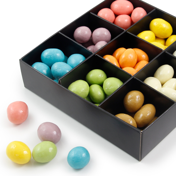 Pailgoje natūralios spalvos tvirto kartono dėžutėje – įvairiausiomis spalvomis marginti baltojo šokolado velykiniai kiaušiniai, puošti liofilizuotų uogų gabalėliais. Šie dražė su migdolais – puikus pasirinkimas, ieškantiems deserto, artimo įmonės stiliaus ar logotipo spalvoms.