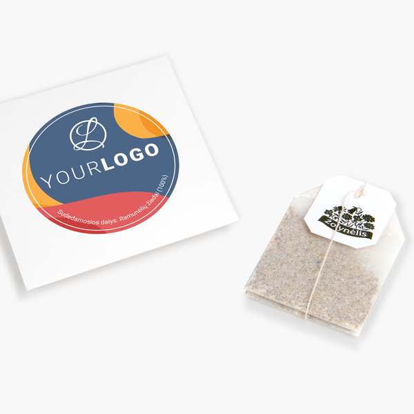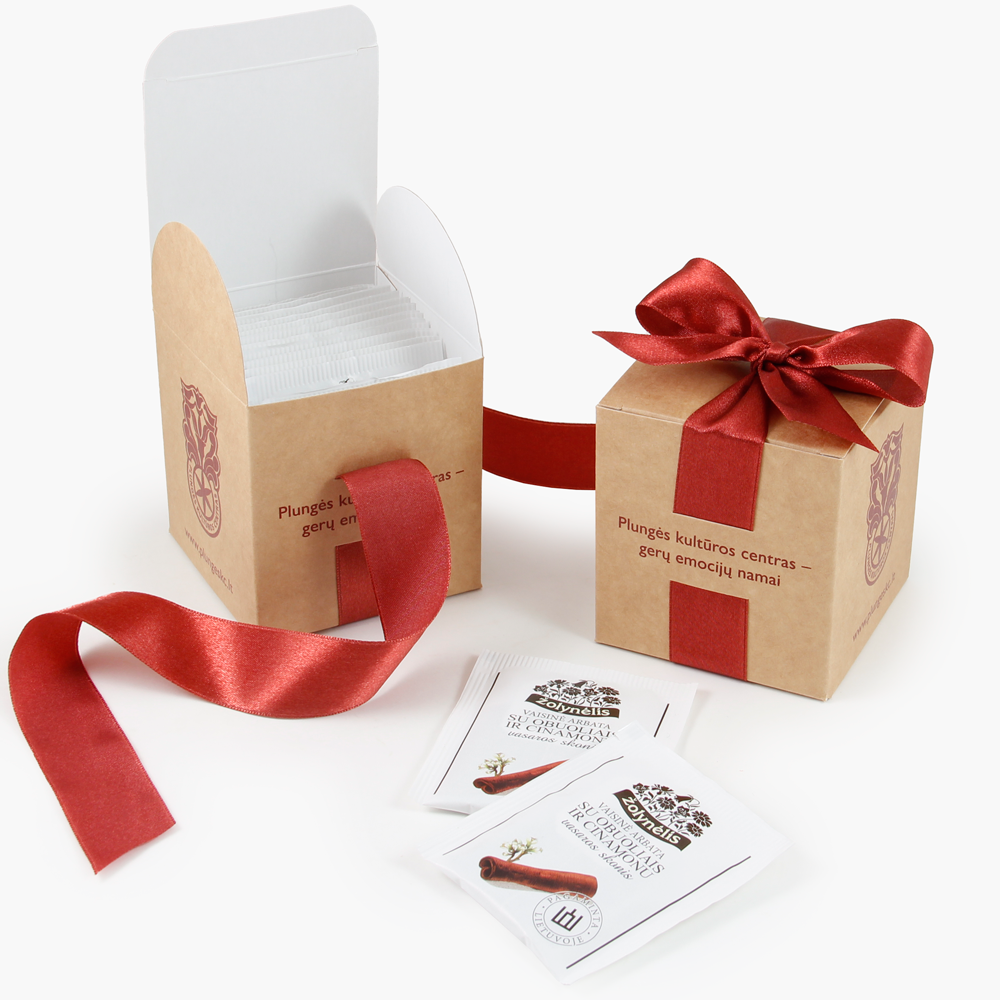 Lietuvoje pagaminta vaisinė arbata arba žolelių mišiniai dėžutėje su logotipu. Natūraliai rūdos spalvos dėžutės su išraižytu logotipu arba balta dėžutė su atspaustu logotipu ir priderintos spalvos juostele.
