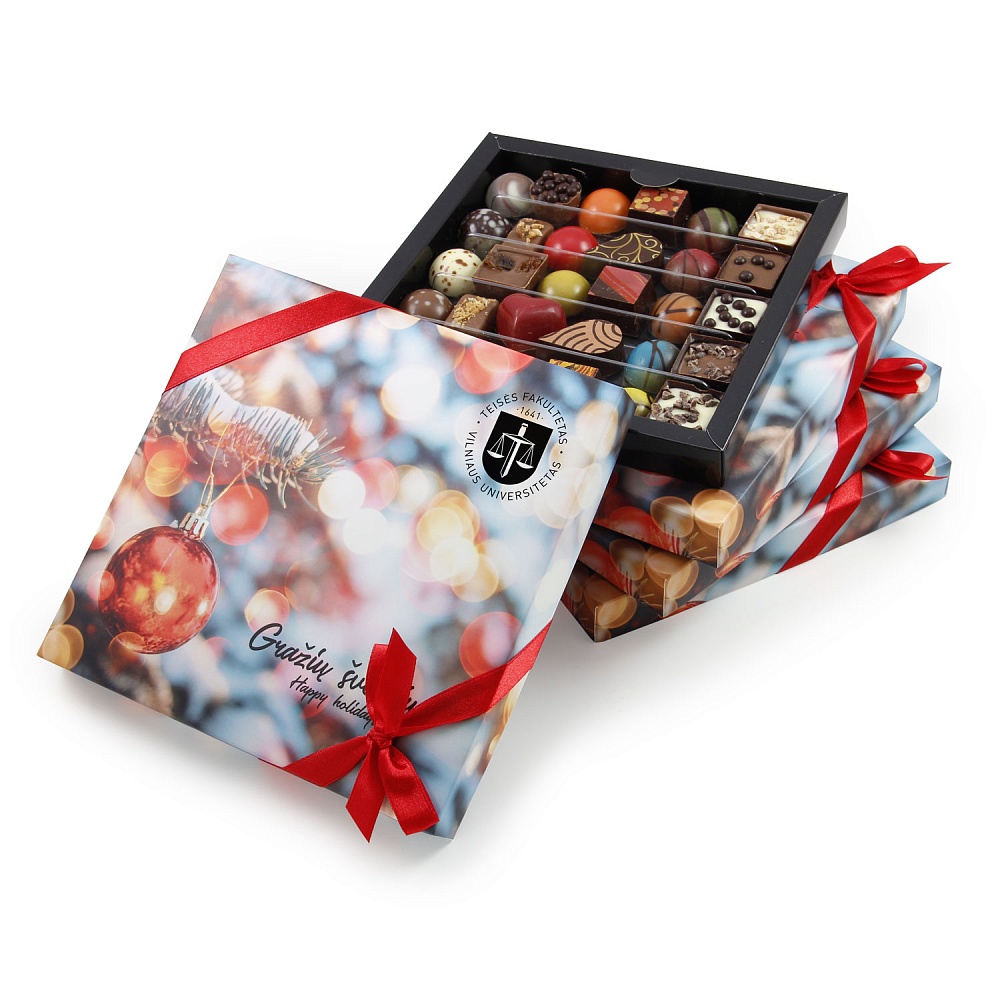 Šokoladinių saldainių rinkinys kompaktiškoje dėžutėje su logotipu – subtili ir elegantiška dovana jūsų verslo partneriams, klientams ar darbuotojams