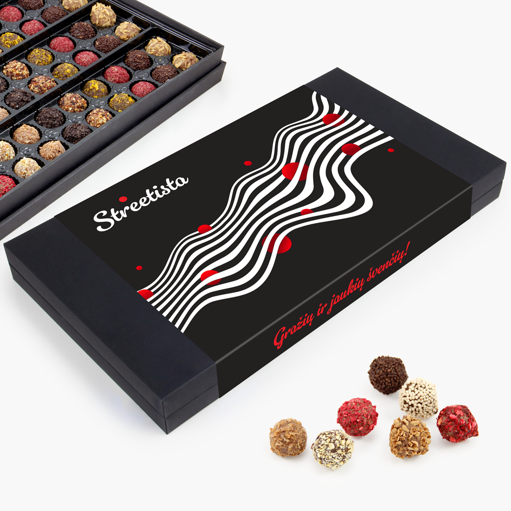Prabangus įspūdingo dydžio įvairių skonių triufelių rinkinys juodos spalvos dėžutėje. Logotipas gali būti išraižytas ant viršelio, atspaustas ant įklijos arba ant atlasinės juostelės.